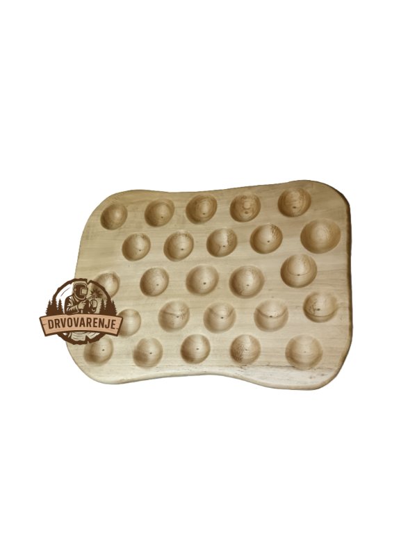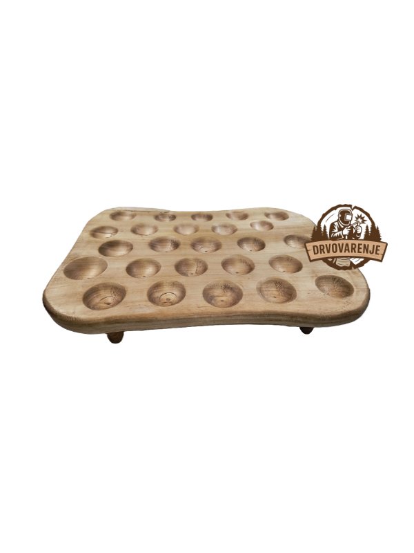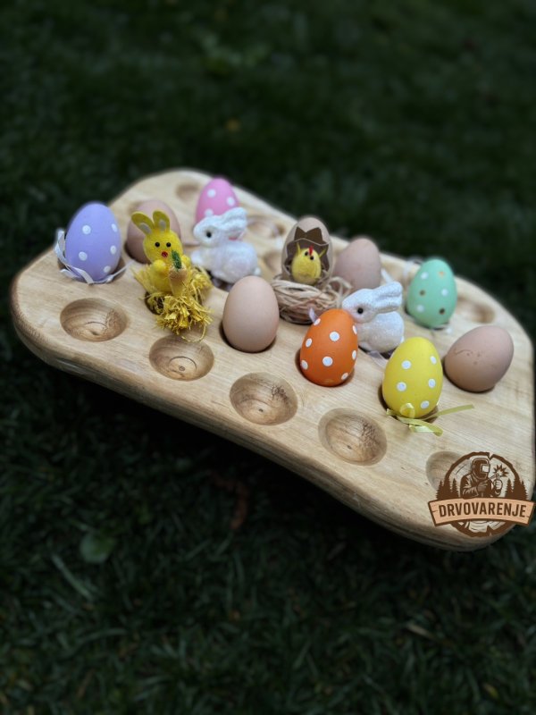 Ručno rađen drveni stalak za jaja namenjen je organizaciji, čuvanju i dekorativnom izlaganju jaja. Zahvaljujući pažljivo obrađenim ležištima omogućava uredno i pregledno odlaganje većeg broja jaja, što ga čini praktičnim za domaćinstva, farme ili praznične dekoracije.