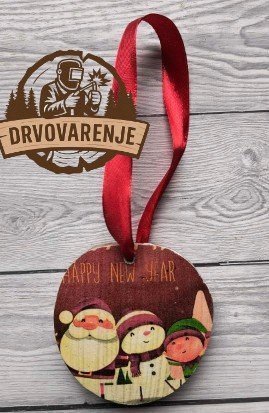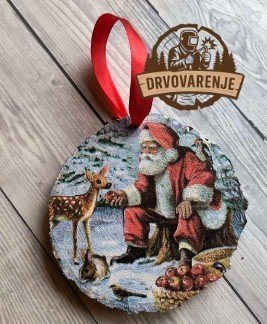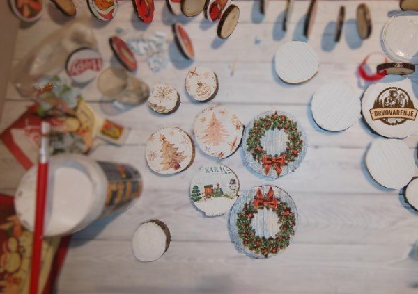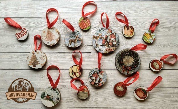 Unikatni novogodišnji ukrasi izrađeni od prirodnog drveta, ručno obrađeni i ukrašeni dekupaž tehnikom.